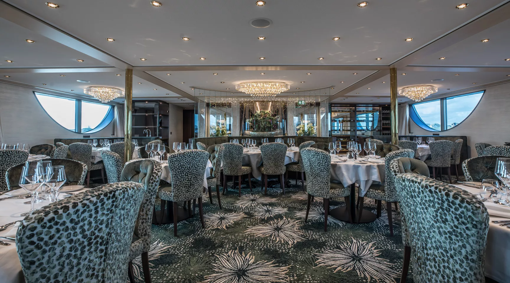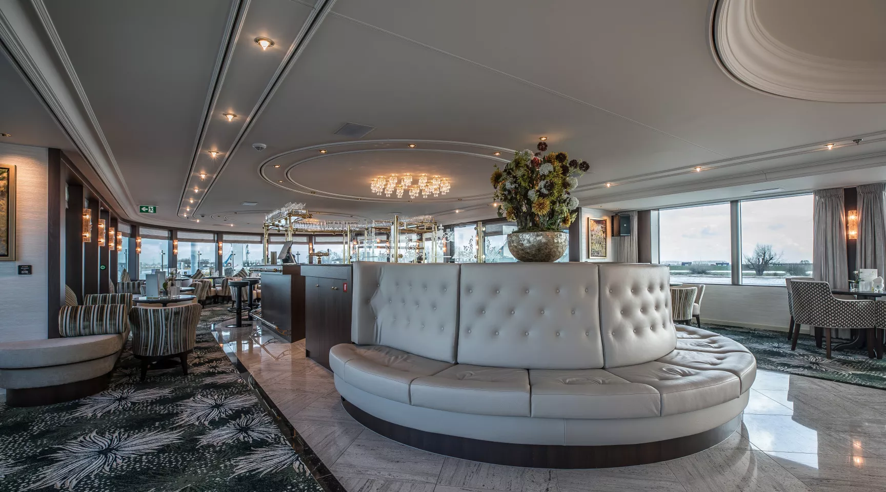 It is extremely difficult to convey just how extraordinary this outstanding ship really is and exactly what distinguishes it from similar vessels. It would be very easy to just say ‘luxurious’ but it’s much more than that; they have deliberately avoided the current trend for a minimalist style where you could be anywhere in the world, creating instead a unique yet exquisite blend of understated taste, style and elegance at the highest level. Immediately striking is just how exceptionally spacious this new vessel is as you enter a gleaming, richly coloured marble-floored lobby flooded with natural light from a stunning atrium above. Moving inside, exceptional creativity from Europe’s finest design studio has produced a superbly balanced masterpiece of onboard style, utilising sustainable rich hardwoods, gleaming brass and polished copper, sparkling glass and intricate wrought iron. The ship is beautifully illuminated throughout – including the exterior and imaginatively furnished with harmonious colour schemes, all designed to create the serene atmosphere reflective of the golden age of cruising.