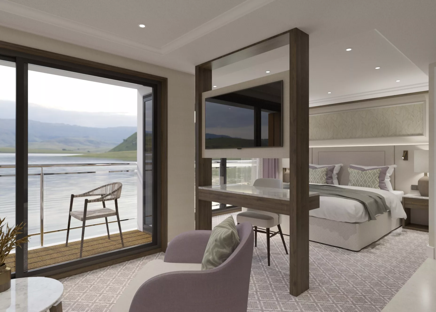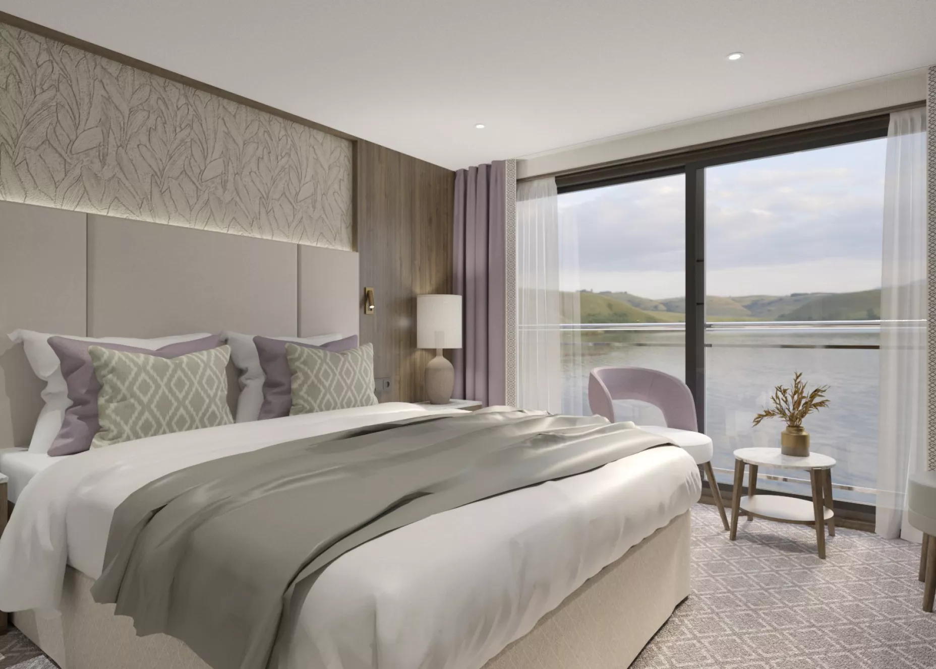 Experience our biggest cabin, the spacious Grand Suites, featuring floor-to-ceiling windows and a private balcony with stunning views. Enjoy a king-sized bed and separate living area.