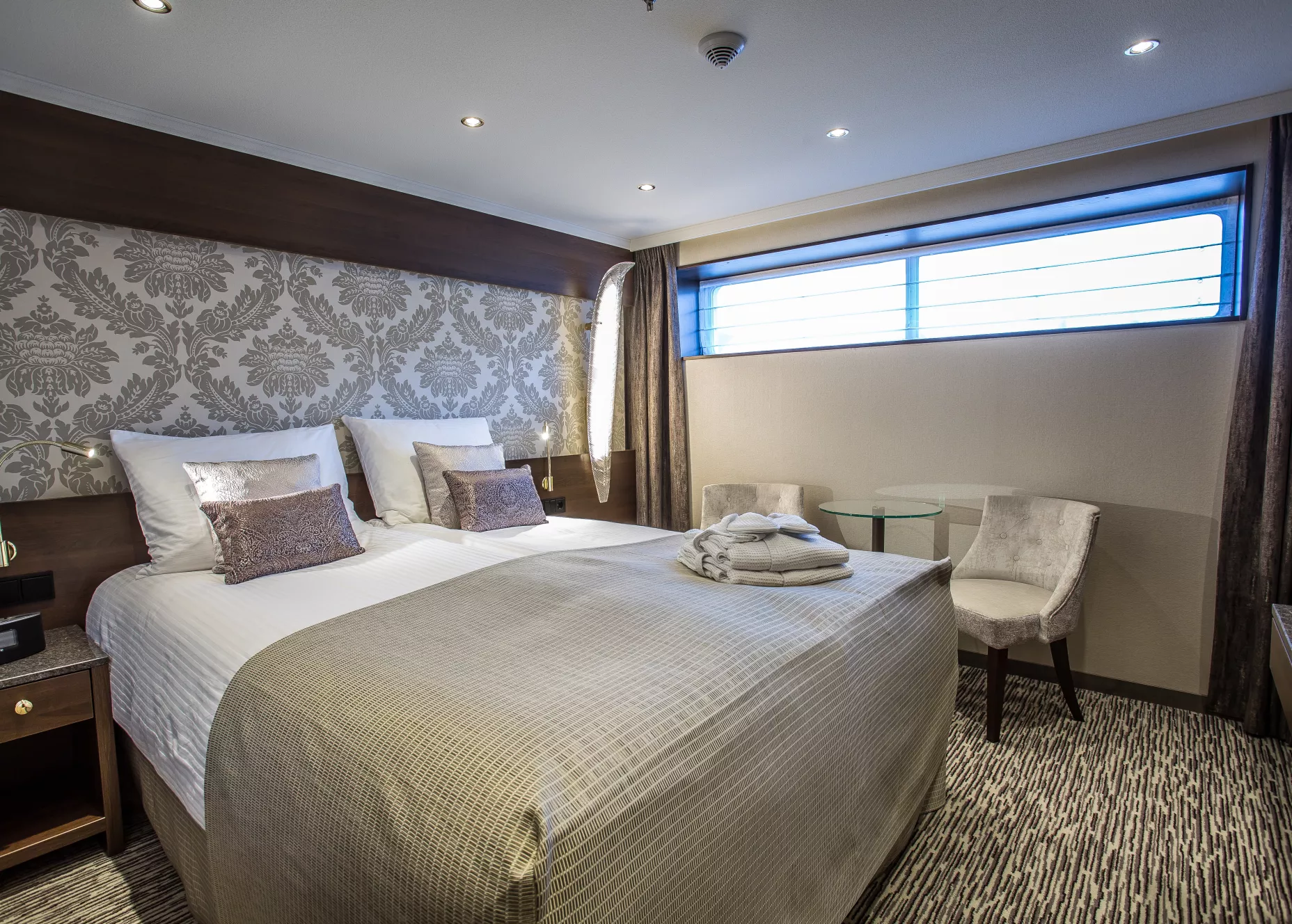 The Emerald Deck Suite offers enhanced comfort and privacy, featuring a fixed window, climate control and a modern ensuite bathroom.