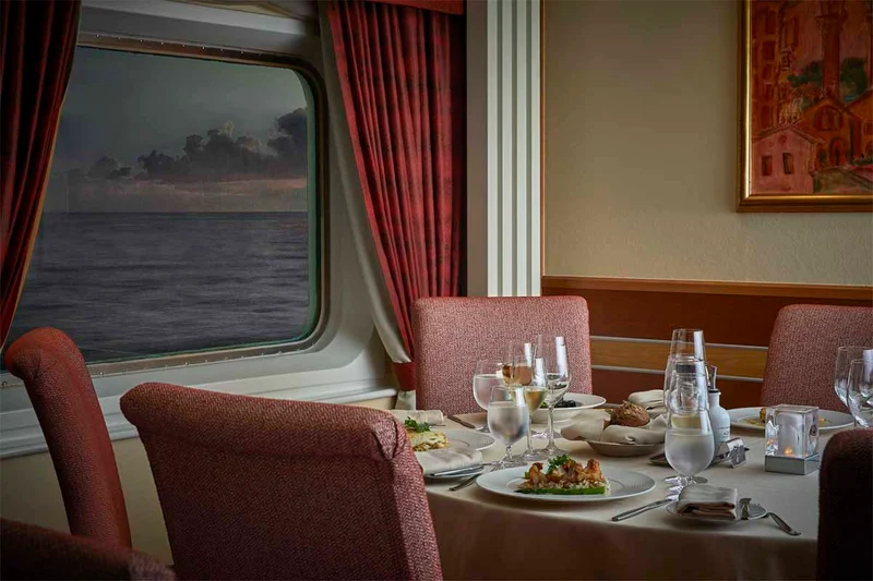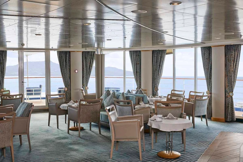 Sparkling with silver, crystal and candlelight, this luxury cruise ship’s main dining room serves contemporary, international cuisine with sophisticated elegance and impeccable service. Menus feature regional specialities unique to the voyage destination, for example, Roasted Chilean Sea Bass while cruising the Chilean fjords and Indian Chicken Korma en route to Mumbai. The Restaurant on board this luxury cruise ship offers open-seating dining, which means there are no assigned times, no assigned tables. You are free to dine when, where and with whom you please.
