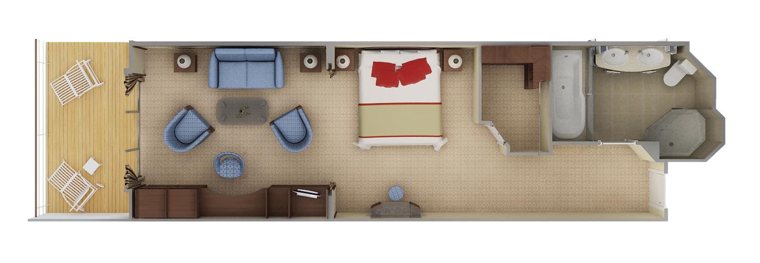 Stately describes the Royal suite. Commanding and majestic. Perfect for entertaining while you cruise. Enough living space to roam.The pinnacle of good living. Available as a one-bedroom configuration or as two-bedrooms (as illustrated) by adjoining with a Veranda Suite.