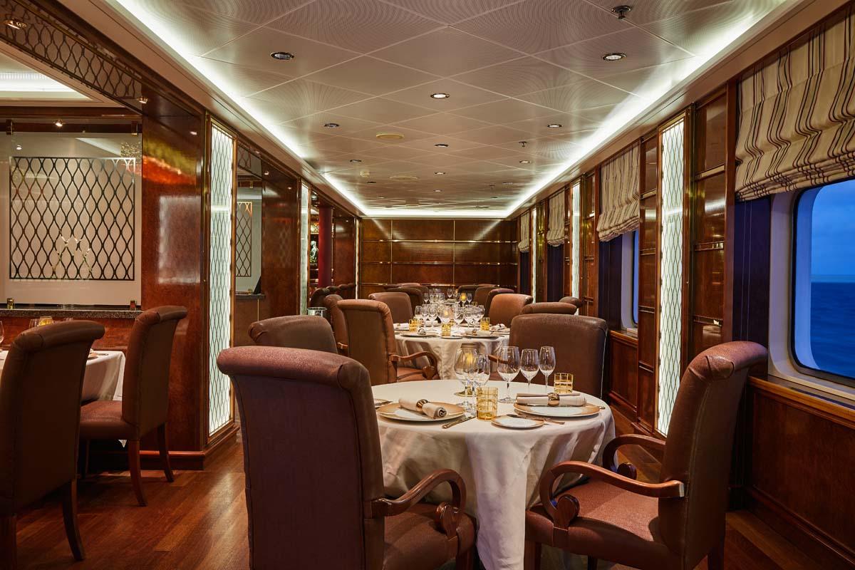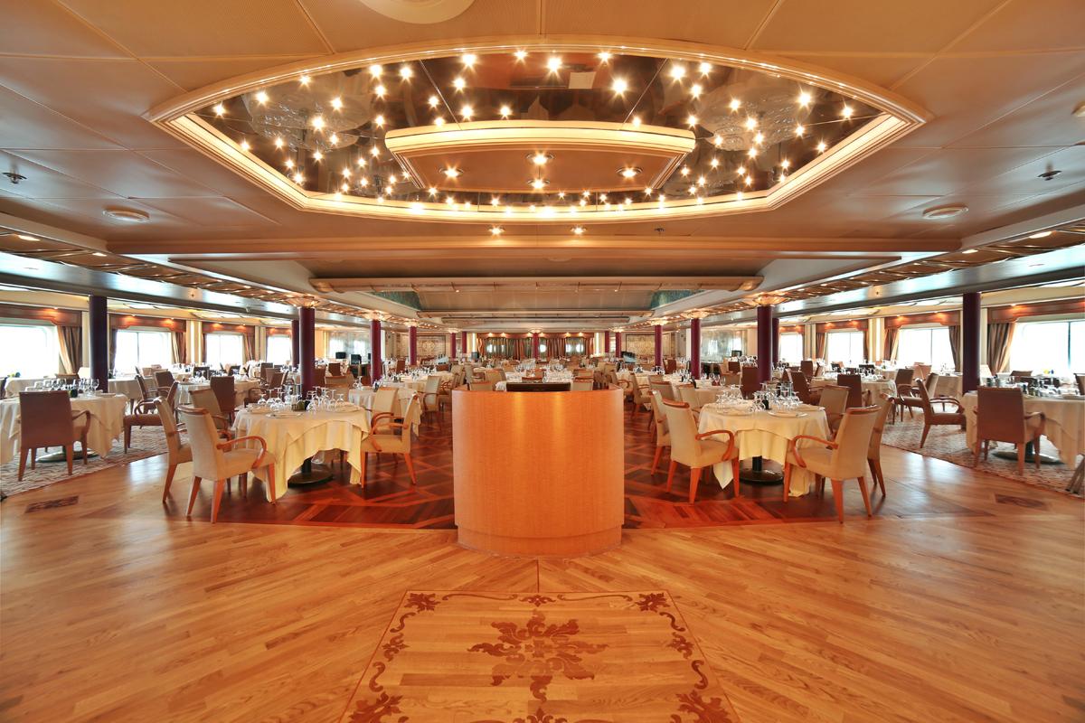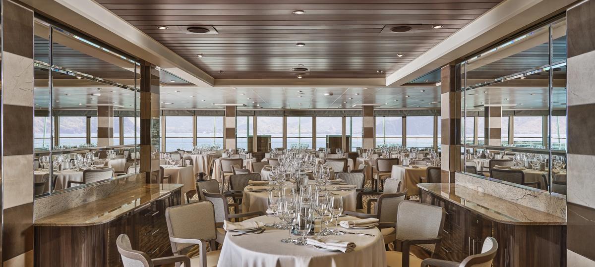Sparkling with silver, crystal and candlelight, this luxury cruise ship’s main dining room serves contemporary, international cuisine with the sophisticated elegance and impeccable service you might expect as part of your prestige travel. Menus feature regional specialities unique to the voyage destination, for example, Roasted Chilean Sea Bass while cruising the Chilean fjords and Indian Chicken Korma en route to Mumbai. The Restaurant on board this luxury cruise ship offers open-seating dining, which means there are no assigned times, no assigned tables. You are free to dine when, where and with whom you please.
