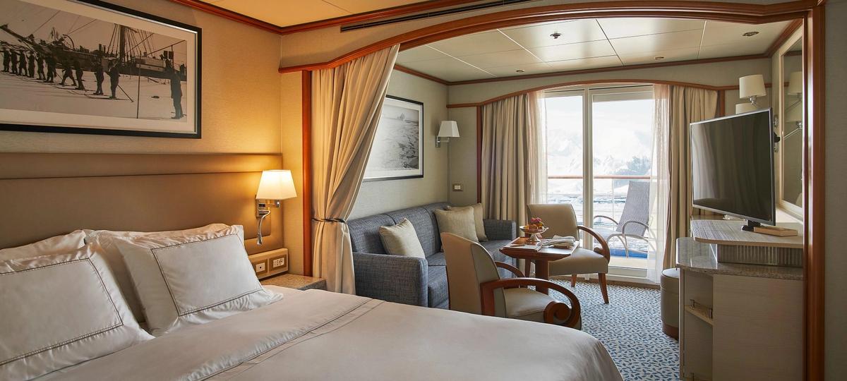 The Deluxe Veranda Suite offers unbeatable views. A Silversea signature. Spacious and welcoming. Floor-to-ceiling glass doors open onto a furnished private teak veranda. Each spectacular sunset feels like it is yours alone. The Deluxe Veranda Suite offers a preferred central location with identical accommodation to a Veranda Suite. No top cruise line would be complete without such a luxury.