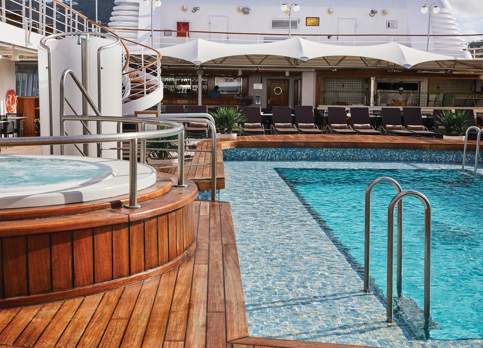 Chaise lounges arranged in the sun or shade. Bubbling whirlpools. The pool water refreshing in warmer climates, heated for cooler weather. The attentive staff at the ready with an oversized towel as you emerge from the pool, with your favourite beverage at just the right moment. The luxury cruise ship of your dreams.
